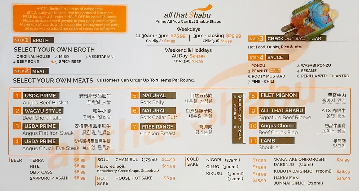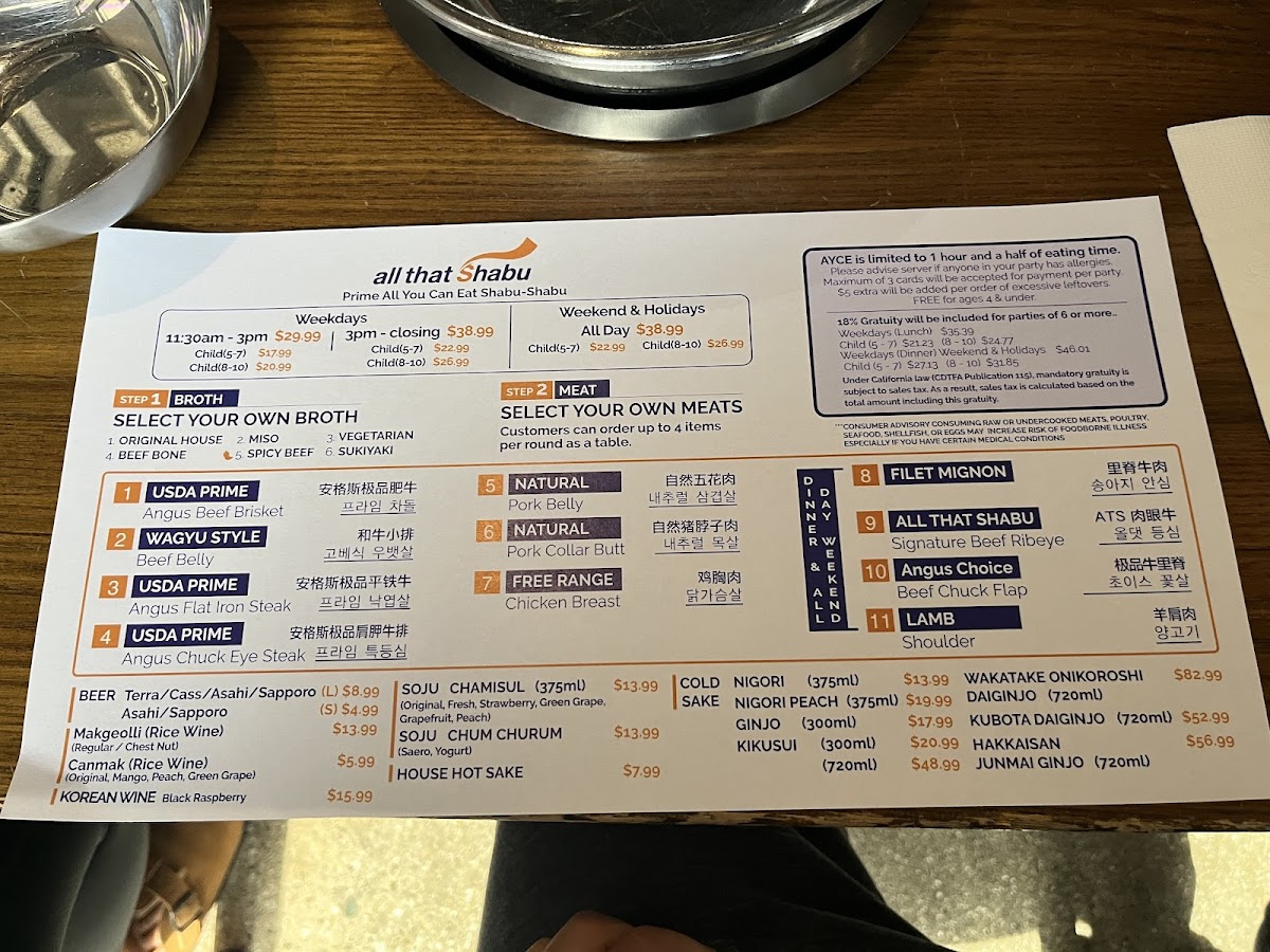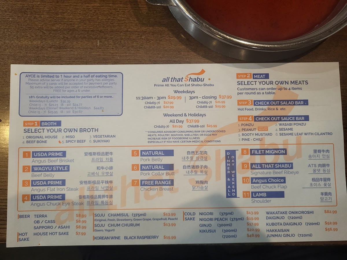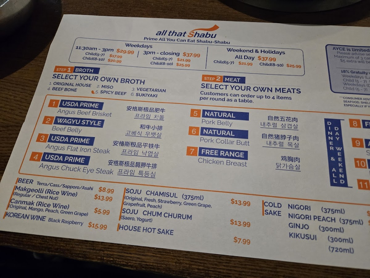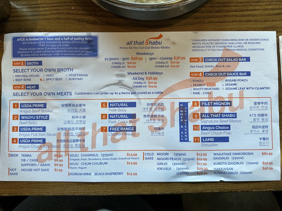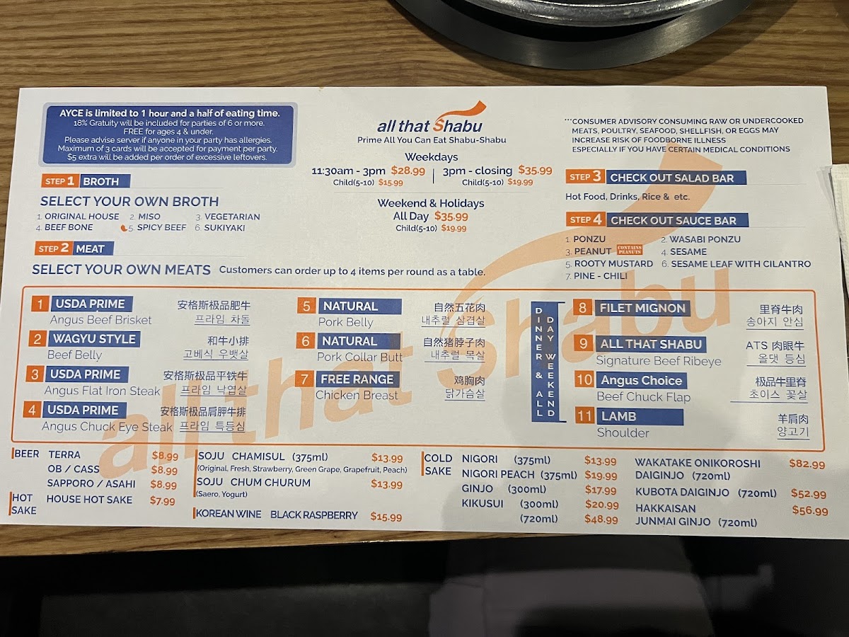 The menu at this shabu-shabu and hot pot restaurant offers a variety of options centered around all-you-can-eat buffet dining. Guests can select from a range of soup bases, including Beef Bone Broth with Wagyu, Tom Yum, Mara Soup Shabu, Spicy Miso, and Miso Soup, which form the foundation for cooking fresh ingredients at the table.